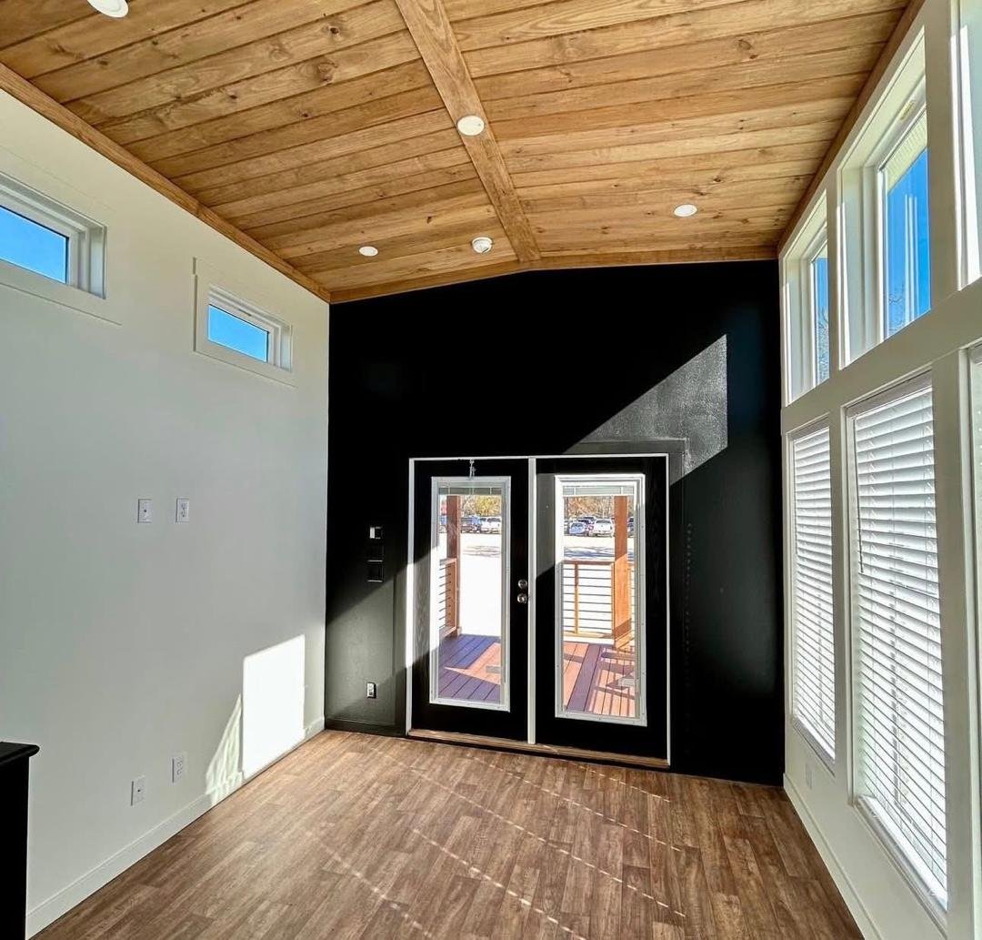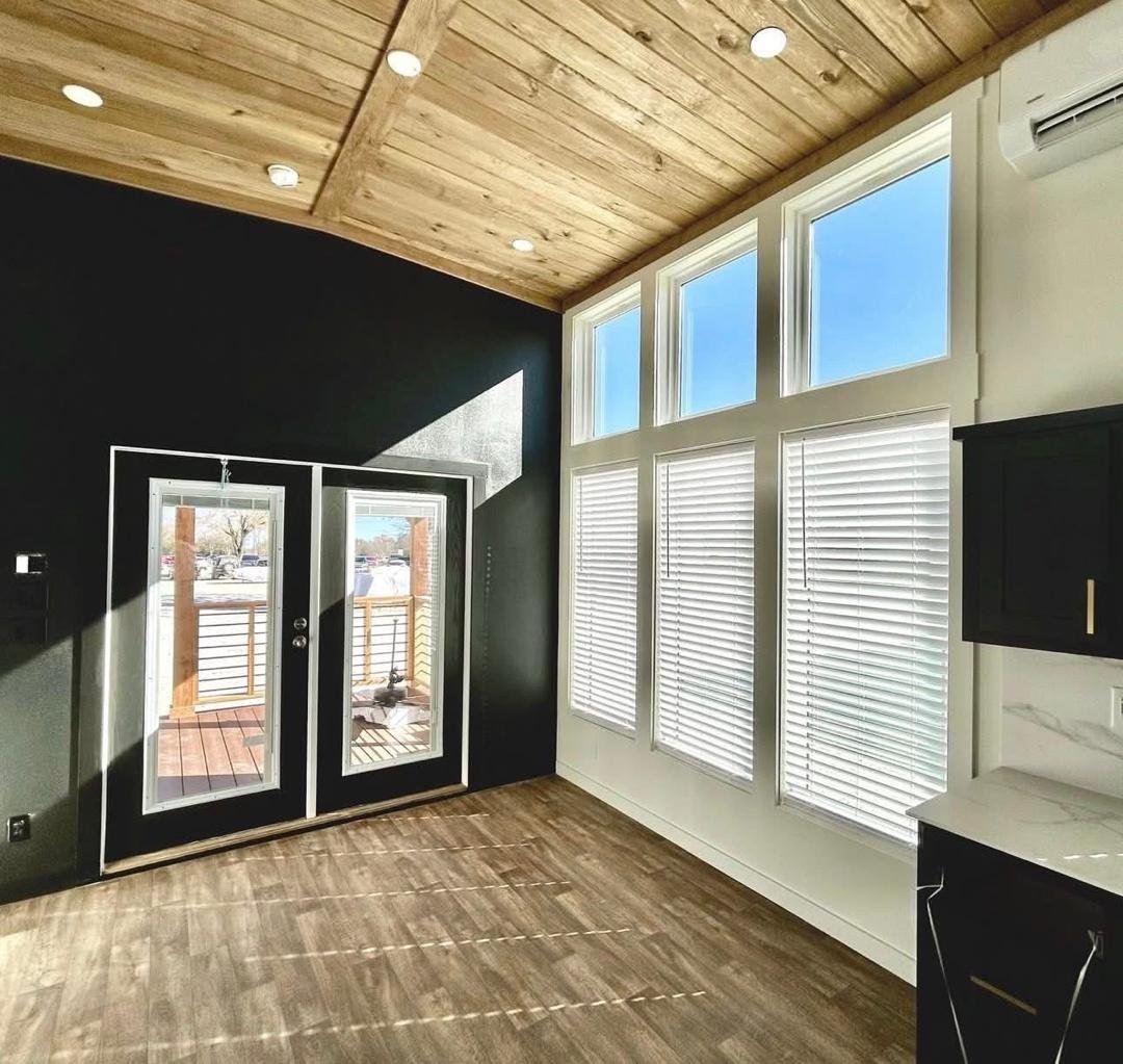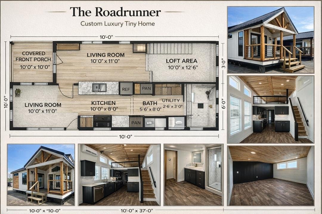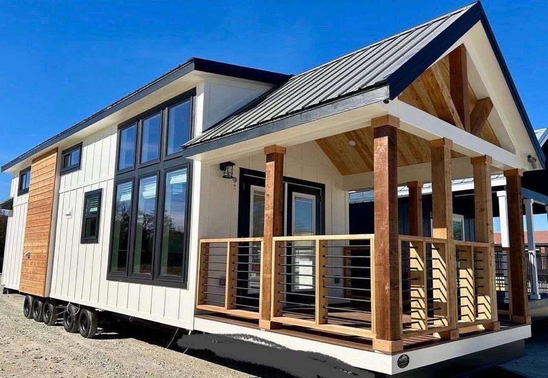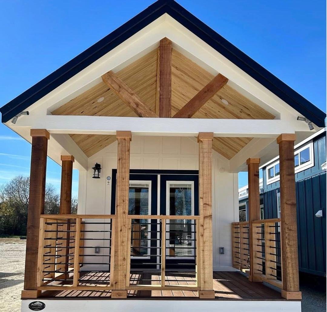 The Roadrunner is a modern custom luxury tiny home for sale with premium upgrades and immediate availability. This park model features a pearl white exterior with bold black and cedar accents and a large 10-foot covered porch for indoor-outdoor living.