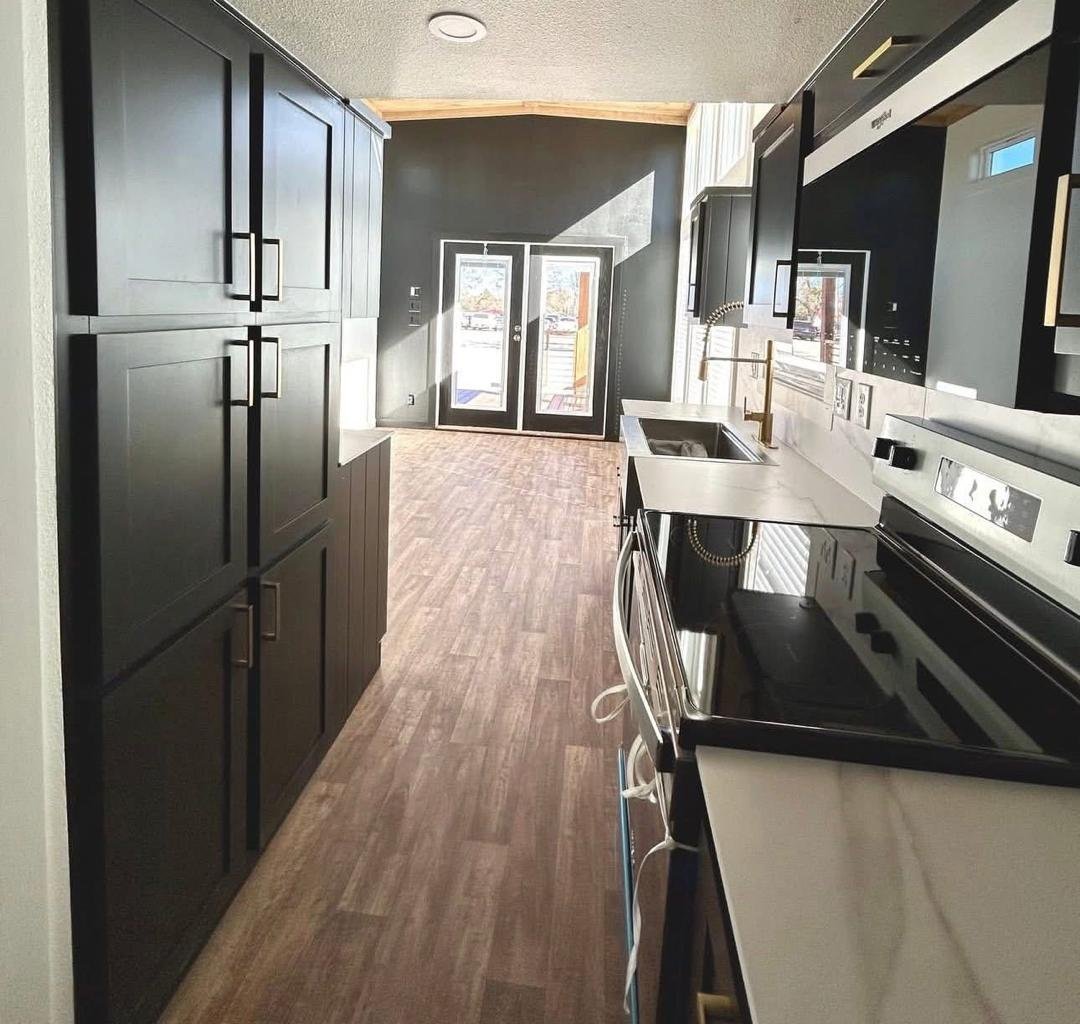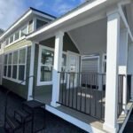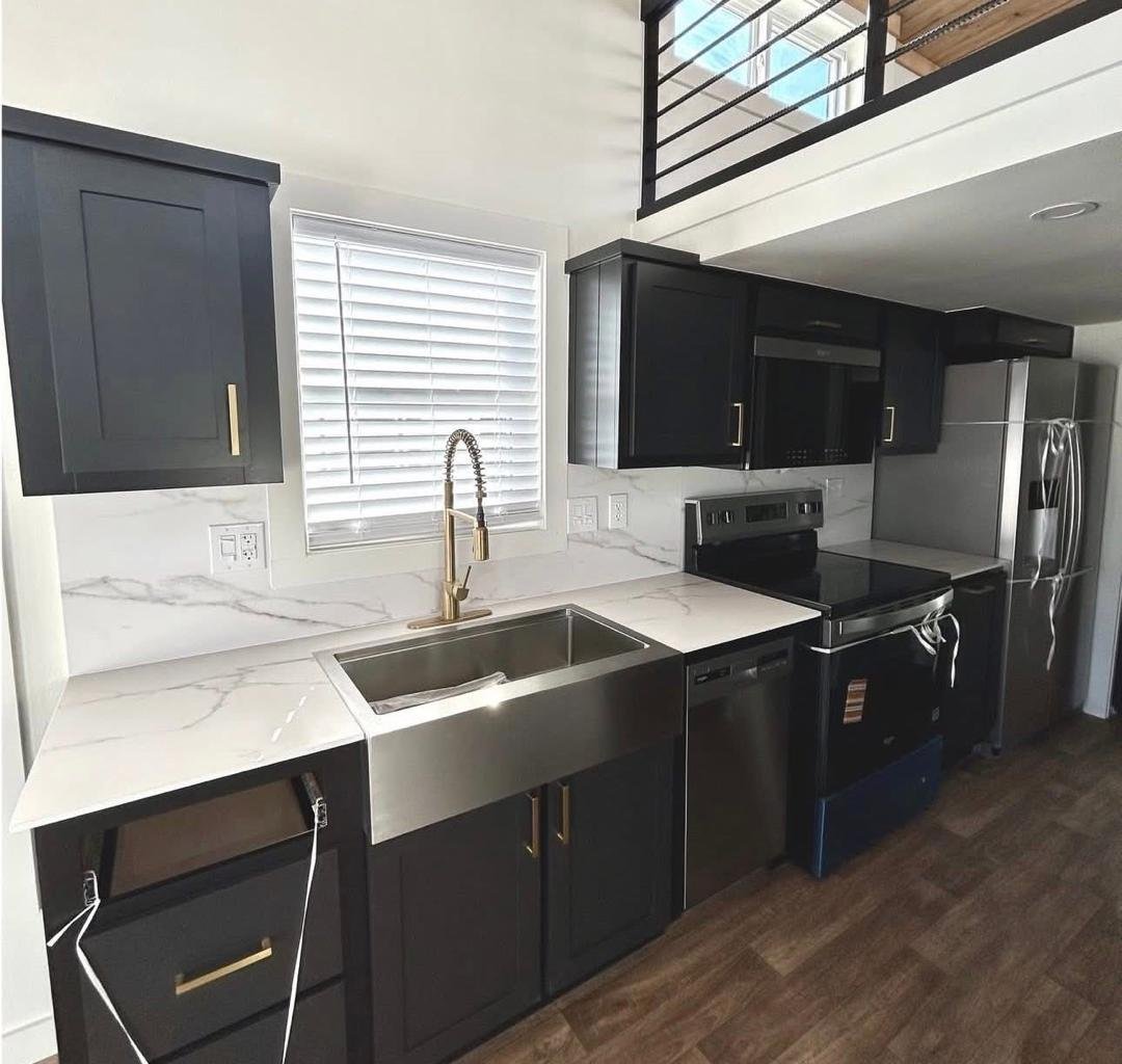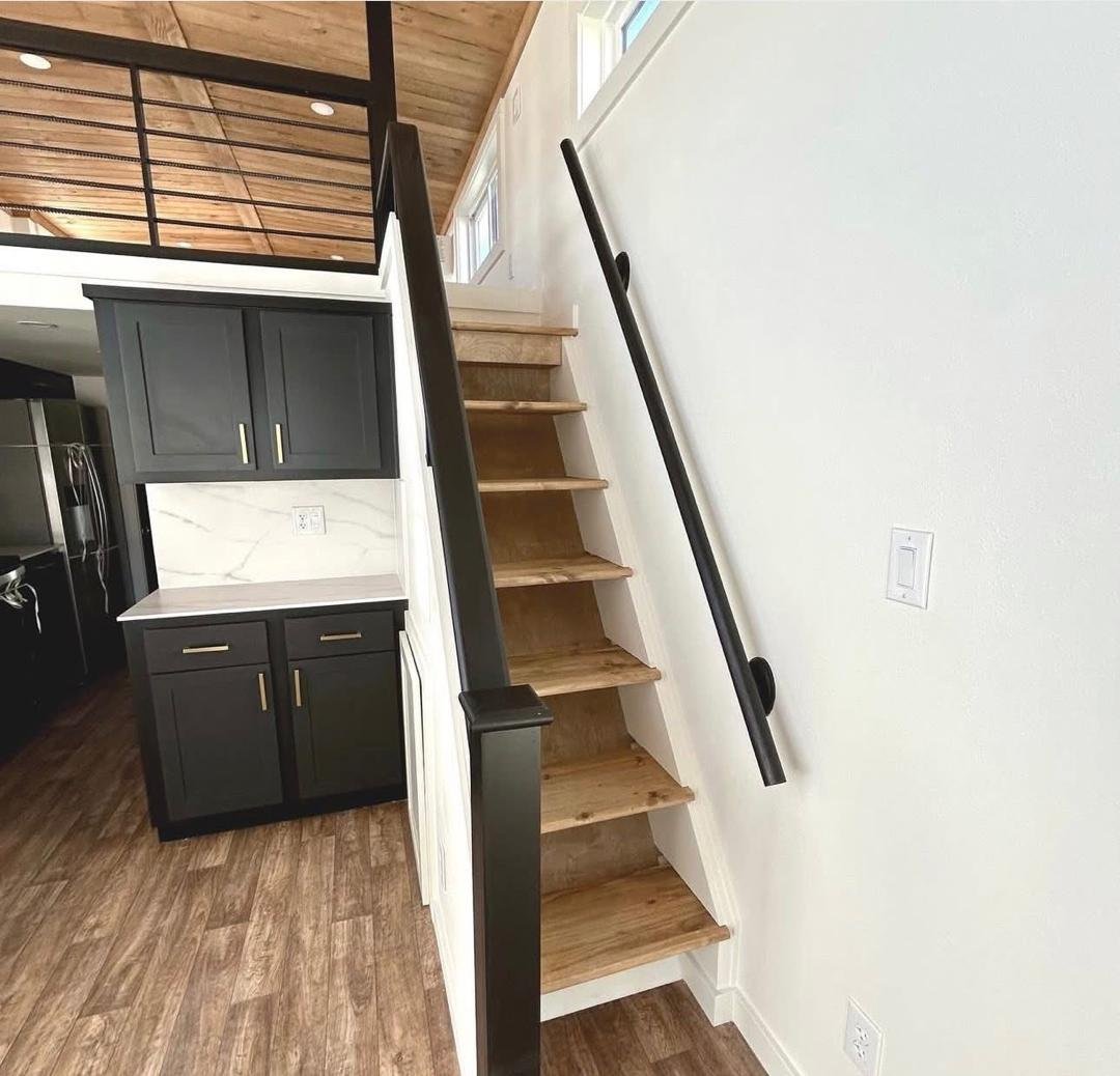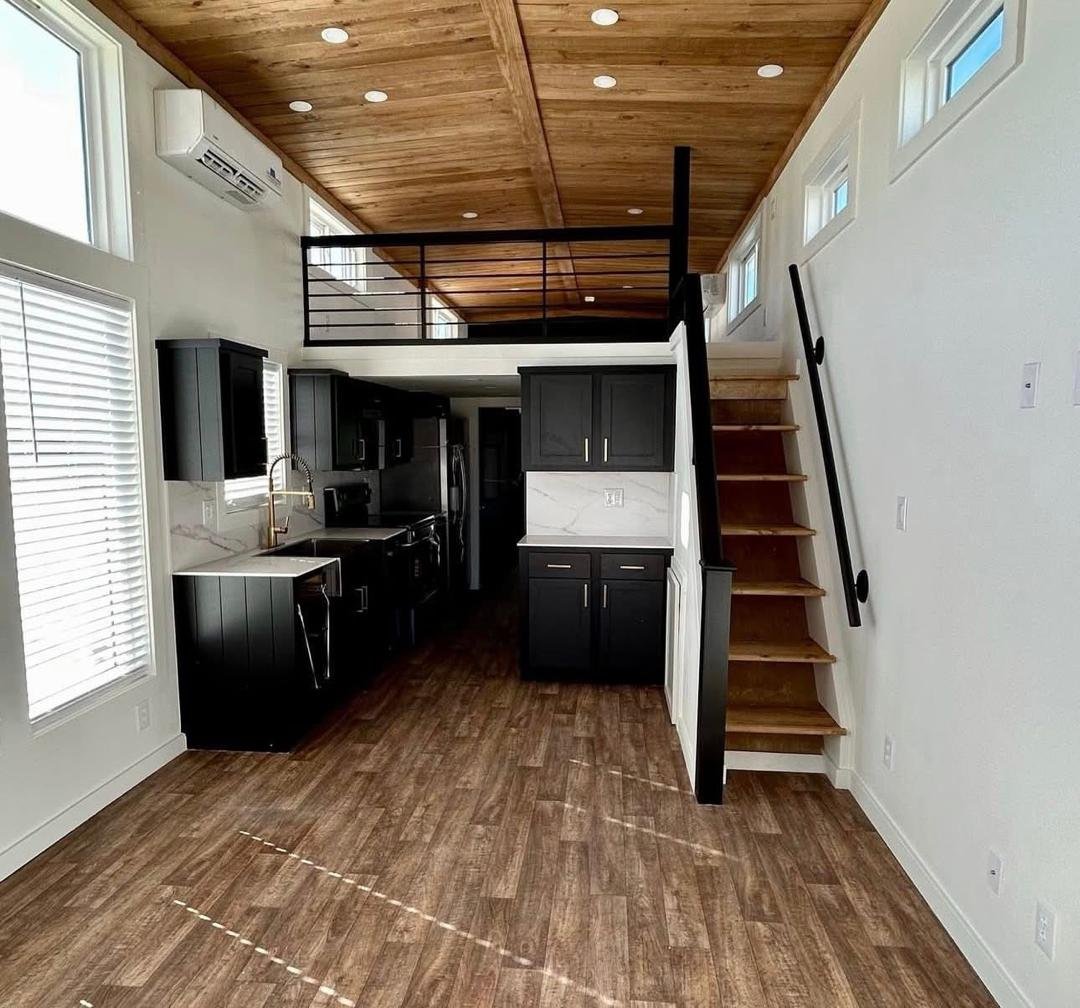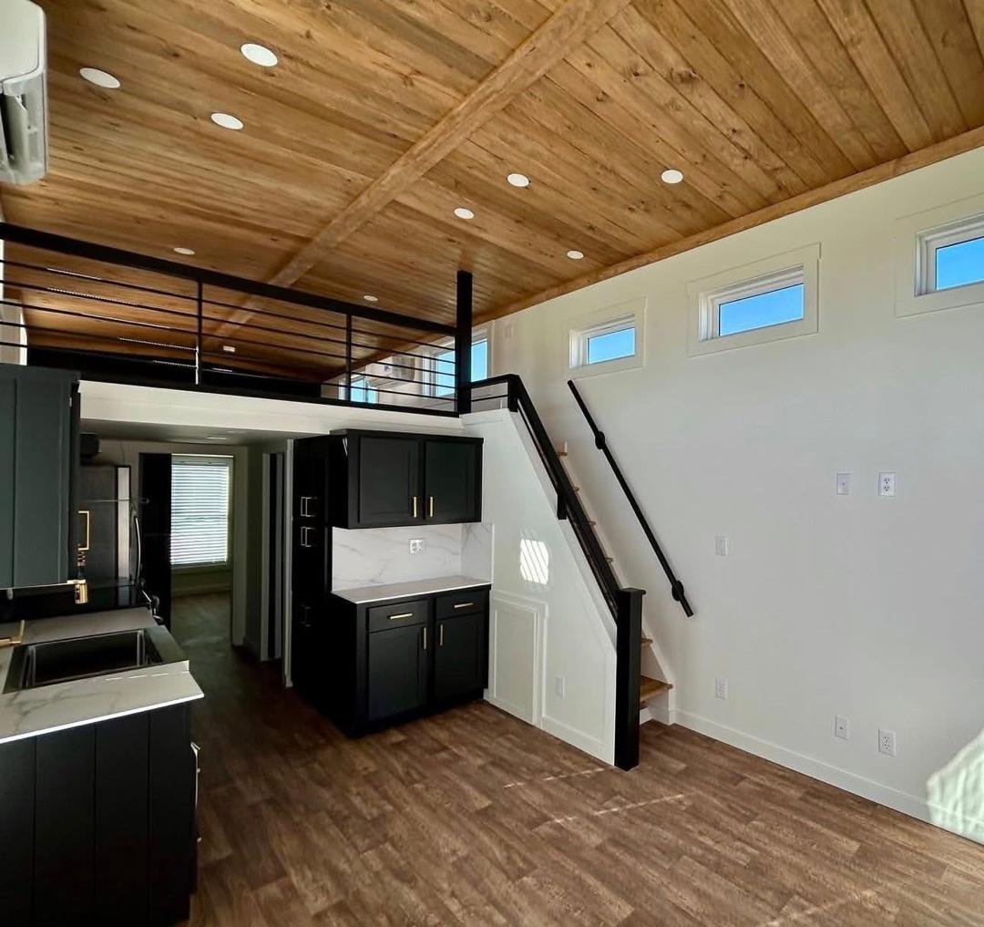 The Roadrunner is a modern custom luxury tiny home for sale with premium upgrades and immediate availability. This park model features a pearl white exterior with bold black and cedar accents and a large 10-foot covered porch for indoor-outdoor living.