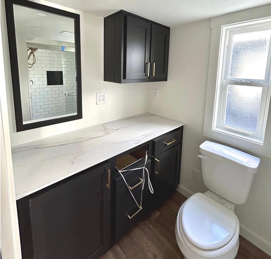 – Custom black cabinetry with gold fixtures