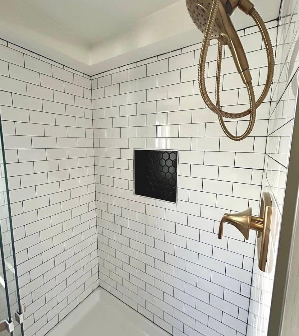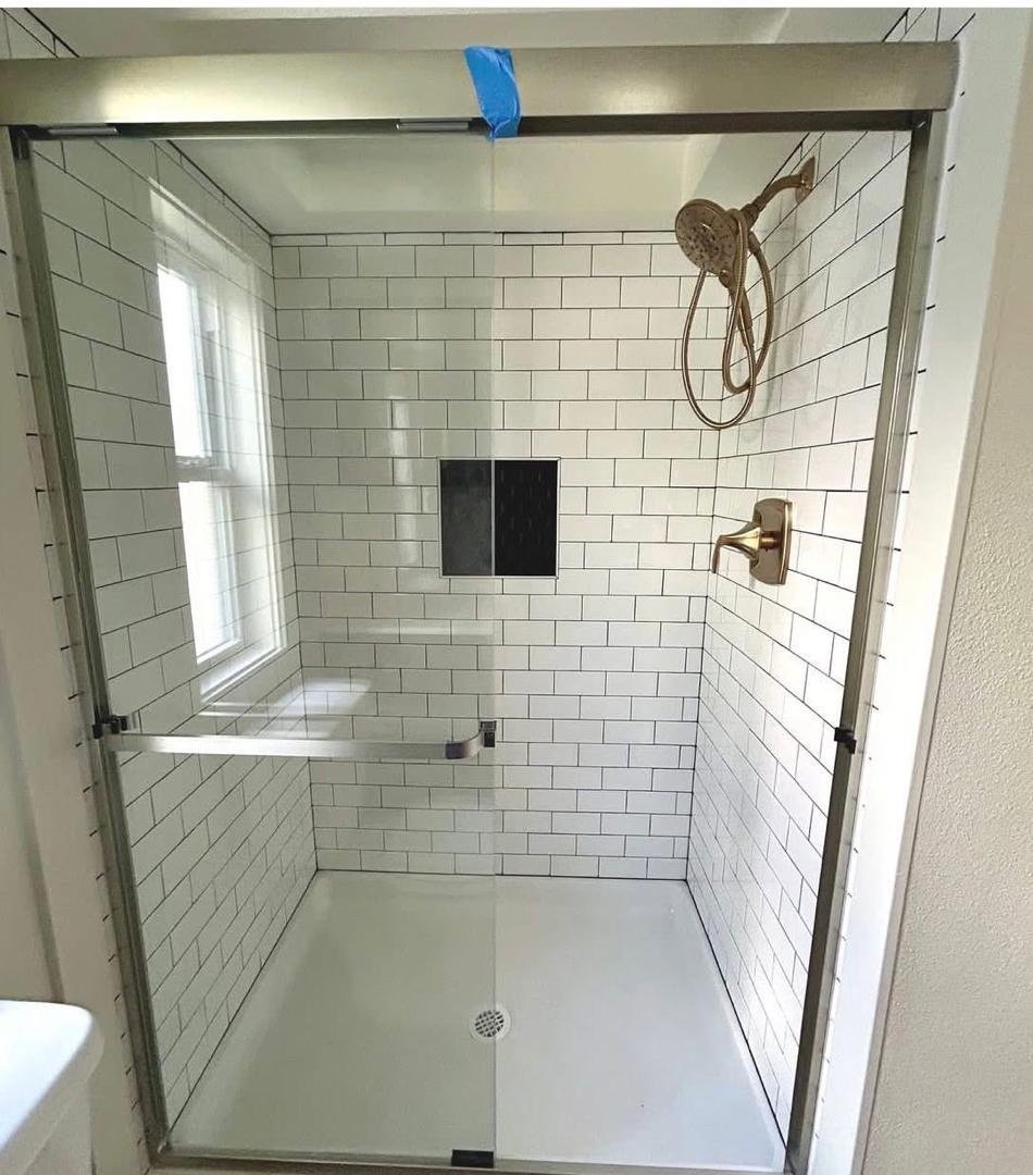 – Spacious bathroom with custom subway tile shower